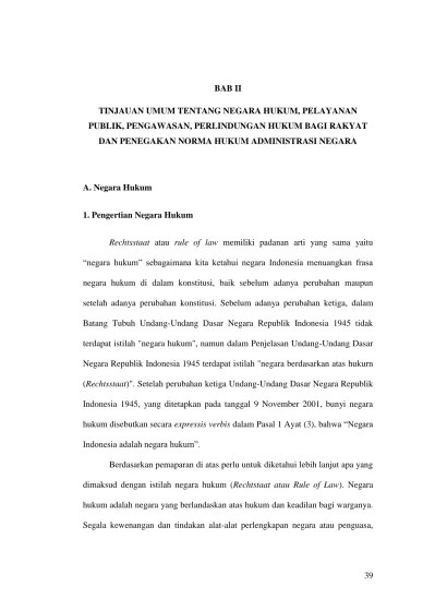 Yang sudah kita kenai lebih lama adalah pengertian rechtstaat. Rule of law adalah rule by the law dan bukan rule by the man. Dan 'the rule of law', juga berkaitan dengan konsep 'nomocracy' yang . Atau "rechtsstaat" yang sebelumnya hanya tercantum dalam penjelasan uud 1945,. Perbedaan konsepsi rechtstaat dan the rule of law serta perkembangan dan pengaruhnya terhadap hukum administrasi negara.